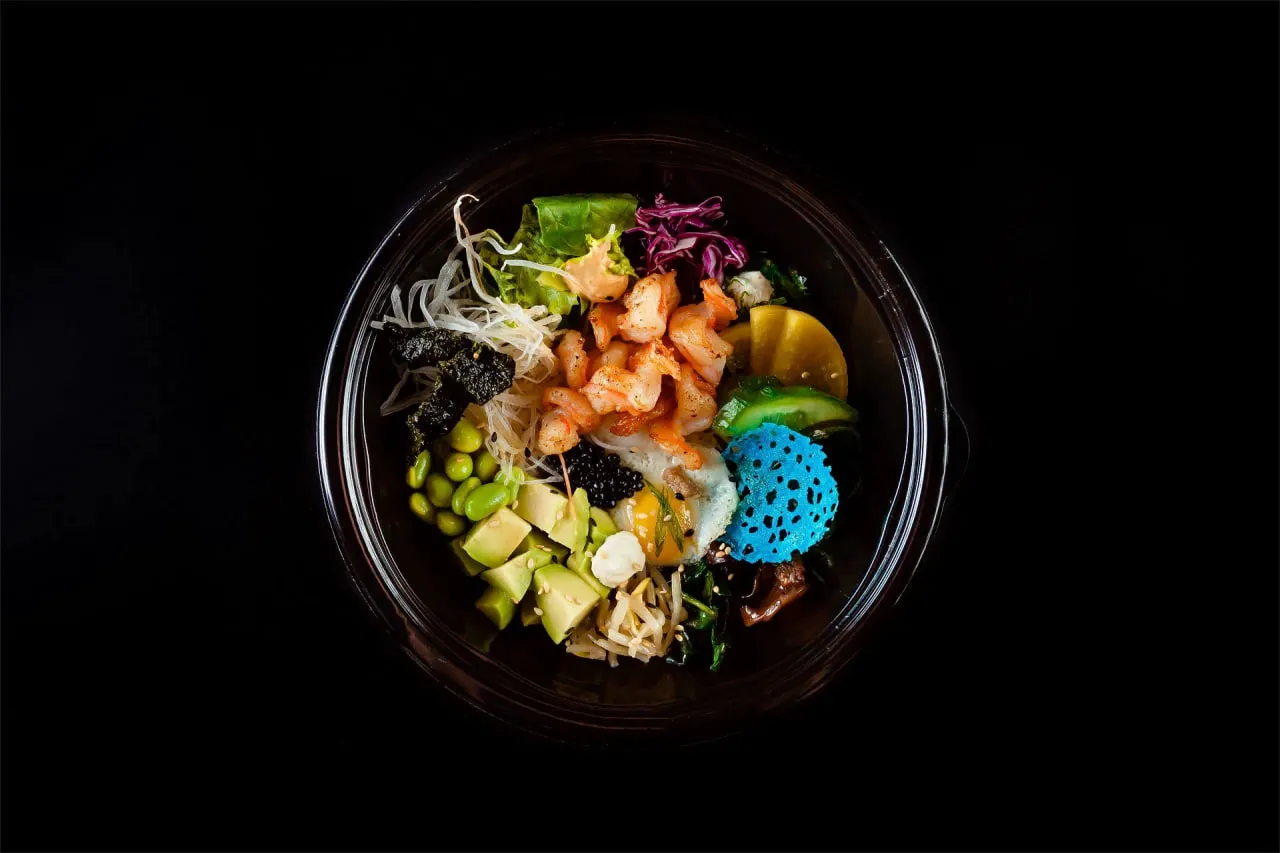 Lettuce leaves, red cabbage, chuka lettuce, takuan, cucumbers, wood mushrooms, shitaki, spinach, pickled bean sprouts, avocado, edamame beans, daikon, quail egg, truffle paste, vegetarian caviar, green onion, sesame oil, nori, caesar sauce, spicy sauce, soy sauce, sesame, sushi rice and shrimp