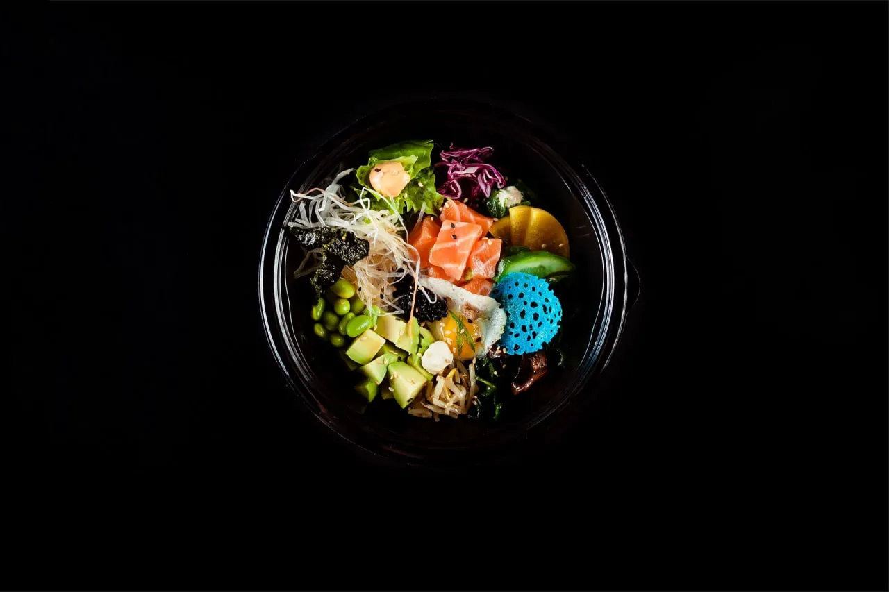 Lettuce leaves, red cabbage, chuka lettuce, takuan, cucumbers, wood mushrooms, shitaki, spinach, pickled bean sprouts, avocado, edamame beans, daikon, quail egg, truffle paste, vegetarian caviar, green onion, sesame oil, nori, caesar sauce, spicy sauce, soy sauce, sesame, sushi rice and salmon