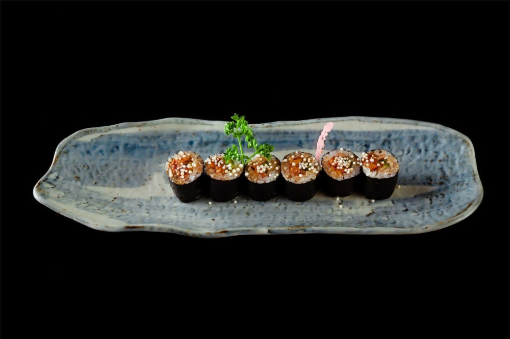 Ысталған жыланбалық, қияр, унаги тұздығы, күнжіт, нори, суши күріші