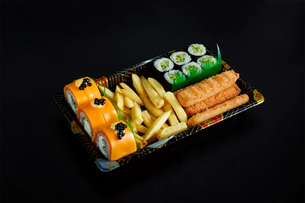 Филадельфия чиз 3 дана, қиярмен хосомаки 6 дана, фри 100 гр, наггетстер 6 дана, кетчуп 50 гр