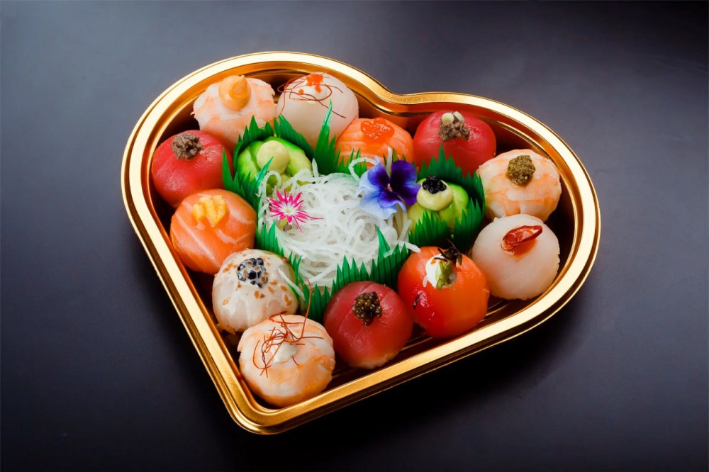 Тунец, ақсерке, гравлакс ақсеркесі, асшаян, алабұға, шинаки күріші,авокадо, қара уылдырық, қызыл уылдырық