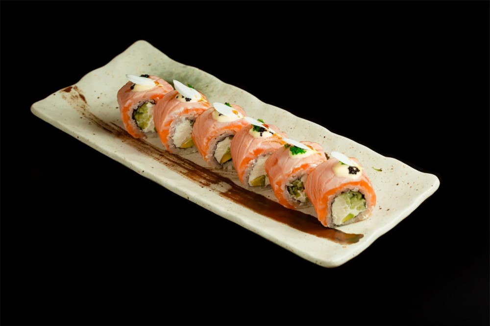 Отқа қақталған ақсерке, қияр, авокадо, сүзбелі ірімшік, цезарь тұздығы, нори, суши күріші