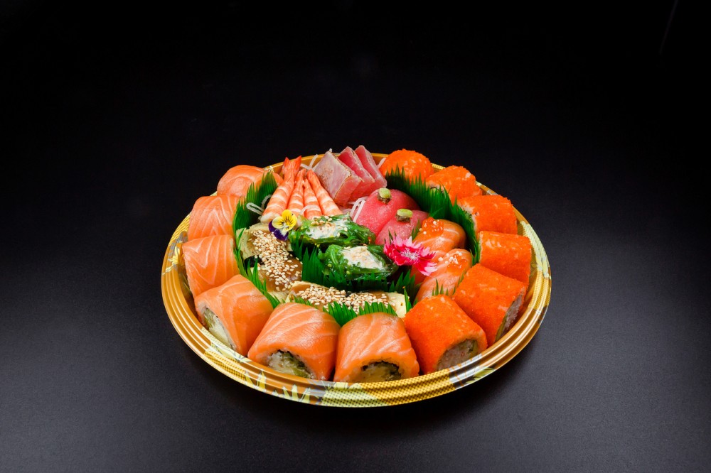 Филадельфия классическая, калифорния маки, суши лосось, суши тунец, суши тамаго, гункан чука, сашими креветки (40гр), сашими тунец (40гр)