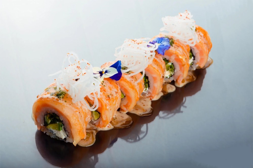Ақсерке, сүзбелі ірімшік, моцарелла, қияр, авокадо, көк пияз, томям тұздығы, шинаки күріші, нори