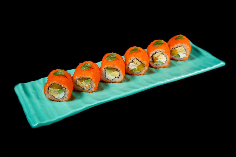 Томаго, сүзбелі ірімшік, авокадо, тобико, манго, суши күріші, нори