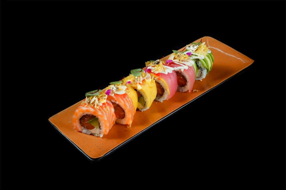 Норвег ақсеркесі, yellow fin тунеці, манго, бадам слайсы, авокадо, құлпынай топпингі, трюфель тұздығы, пай картобы, суши күріші, нори