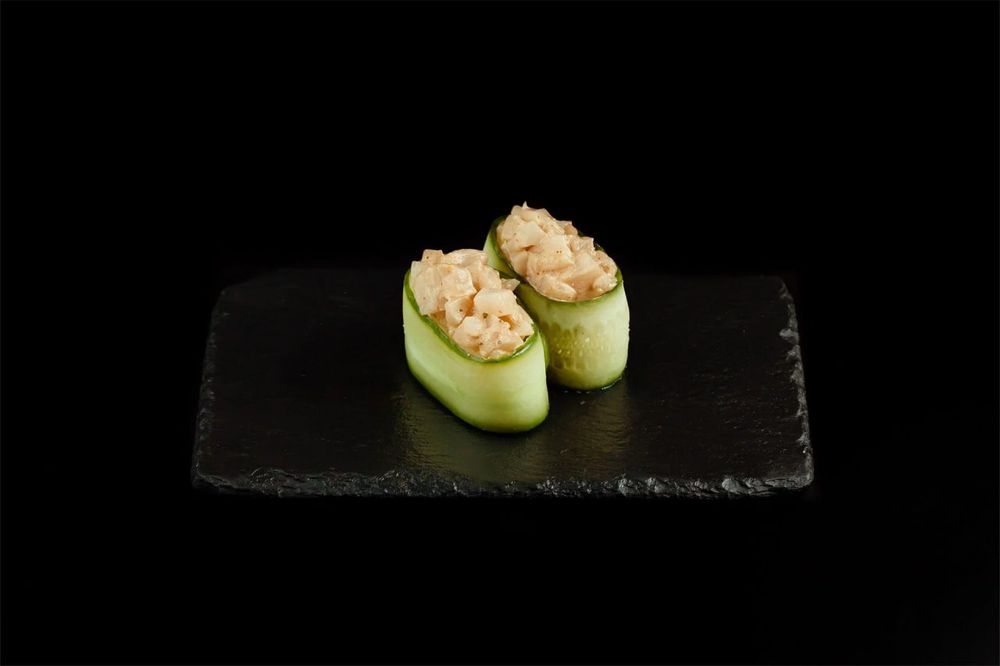 Морской гребешок, огурец, spicy соус, суши рис
