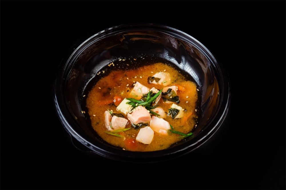 Свежеохлаждённый норвежский лосось, тофу, морские водоросли вакаме, грибы намеко, рыбная соль, соевый соус, кунжут, зеленый лук, бульон мисо