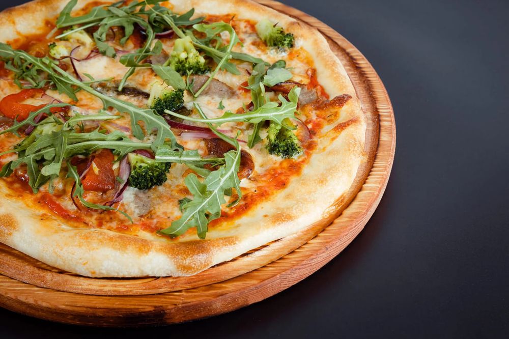 Тесто для пиццы, пицца сыр, томатный соус, колбаски конские, куриная грудка, перец запечённый, красный лук, брокколи, оливковое масло