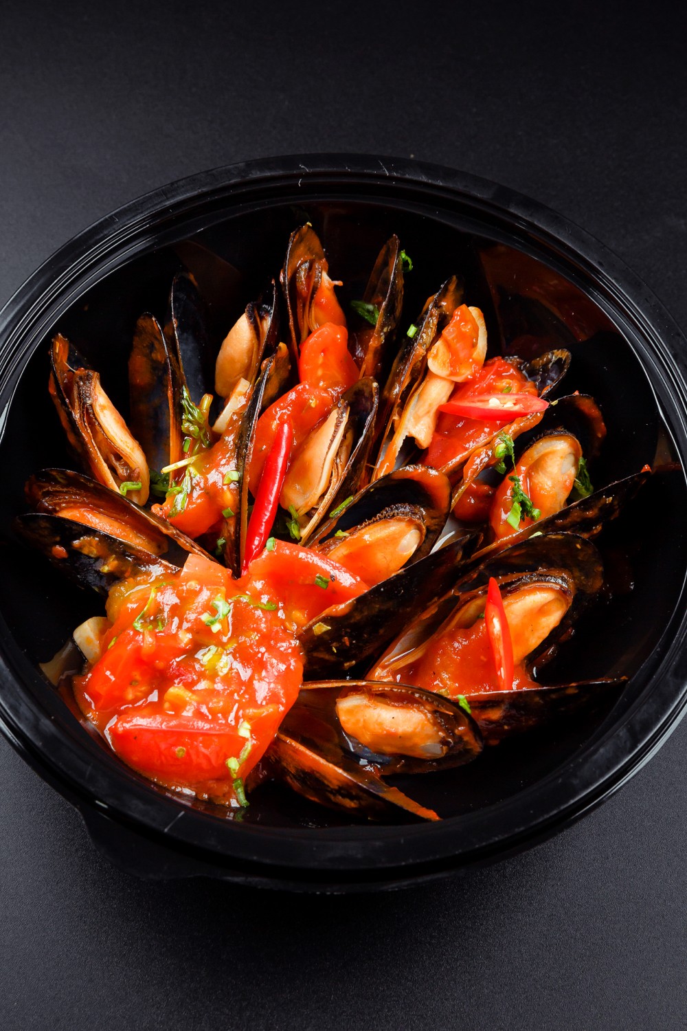 Мидии, томатный соус, унаги соус, помидоры черри, кинза, чеснок.