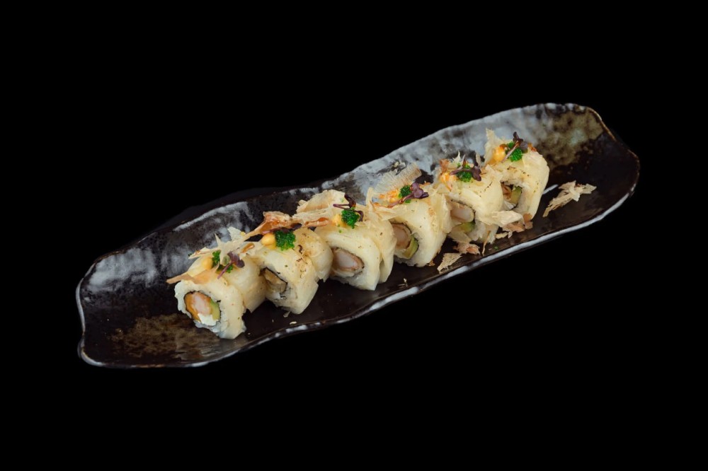 Креветки темпура, опалённые гребешки, авокадо, творожный сыр, spicy соус, суши рис