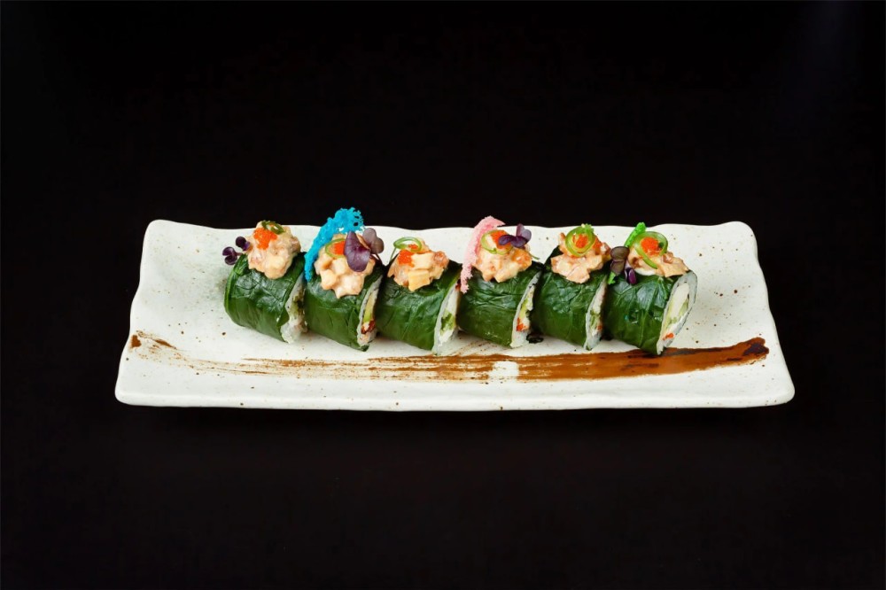 Шпинат, краб сурими, огурцы, икра летучей рыбы тобико, угорь, сыр творожный, авокадо, унаги соус, спайси соус, суши рис и нори