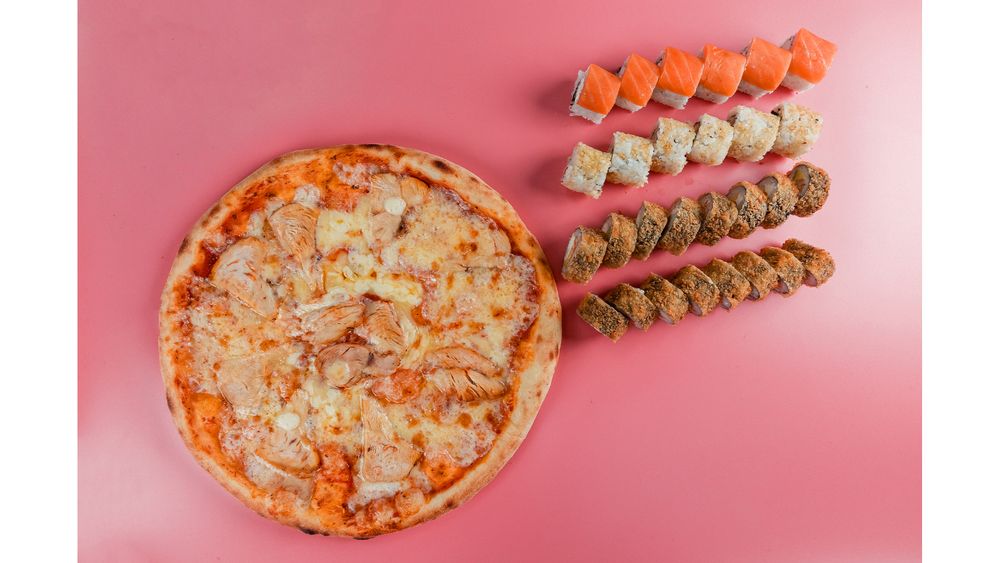 Филадельфия лайт , темпура с креветкой, эби темпура, темпура лососсь ,пицца с курицей.