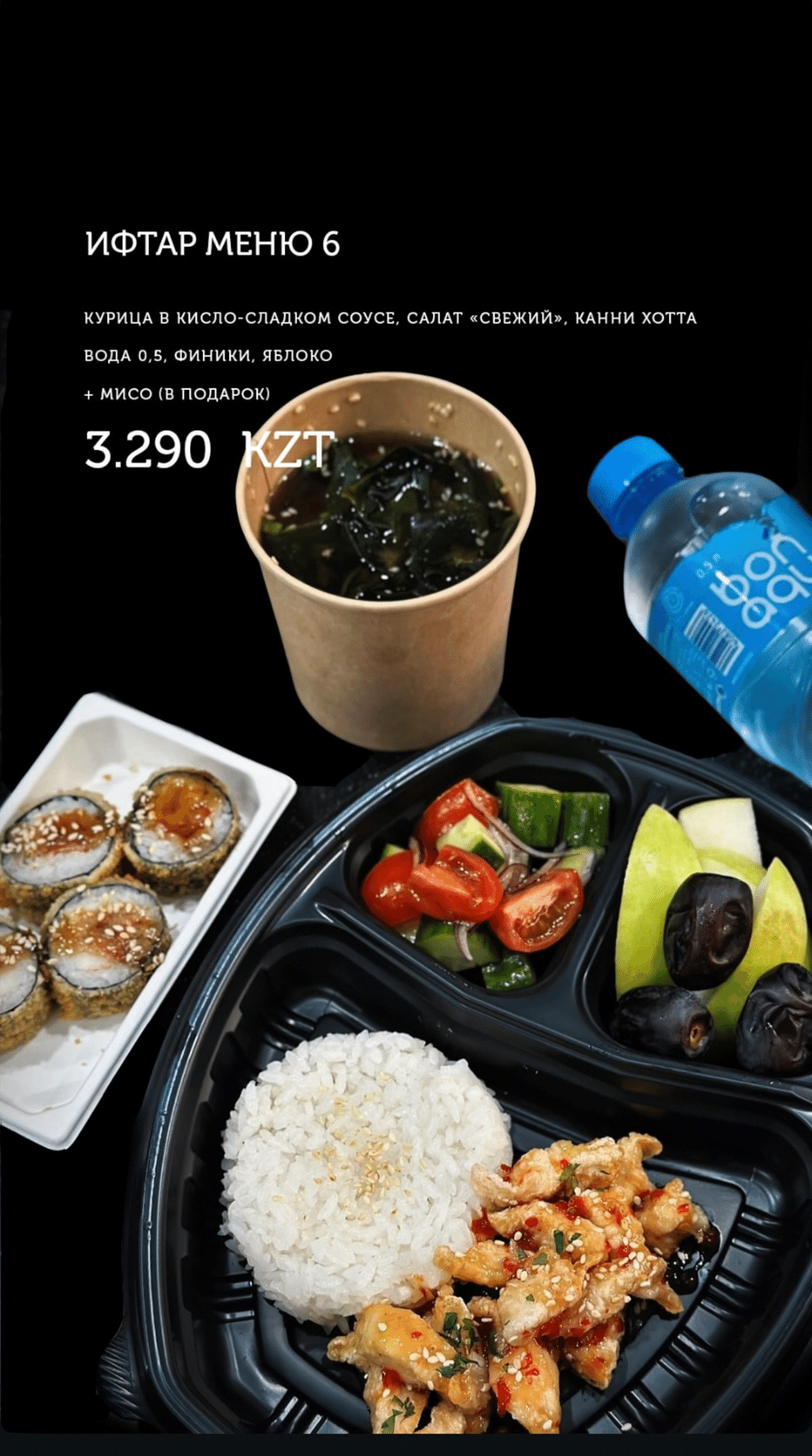 Курица в кисло-сладком соусе, салат "свежий", канни хотта. Вода 0,5, финики, яблоко. + Мисо суп в подарок