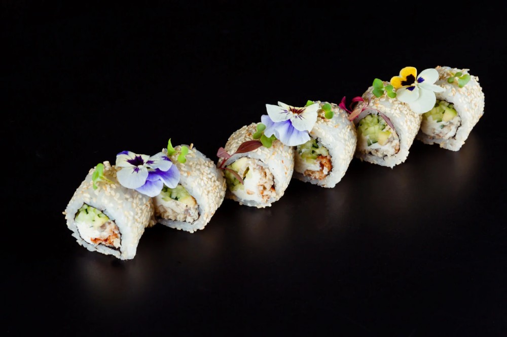 Копченный угорь, авокадо, сыр творожный, огурцы, суши рис, нори, кунжут