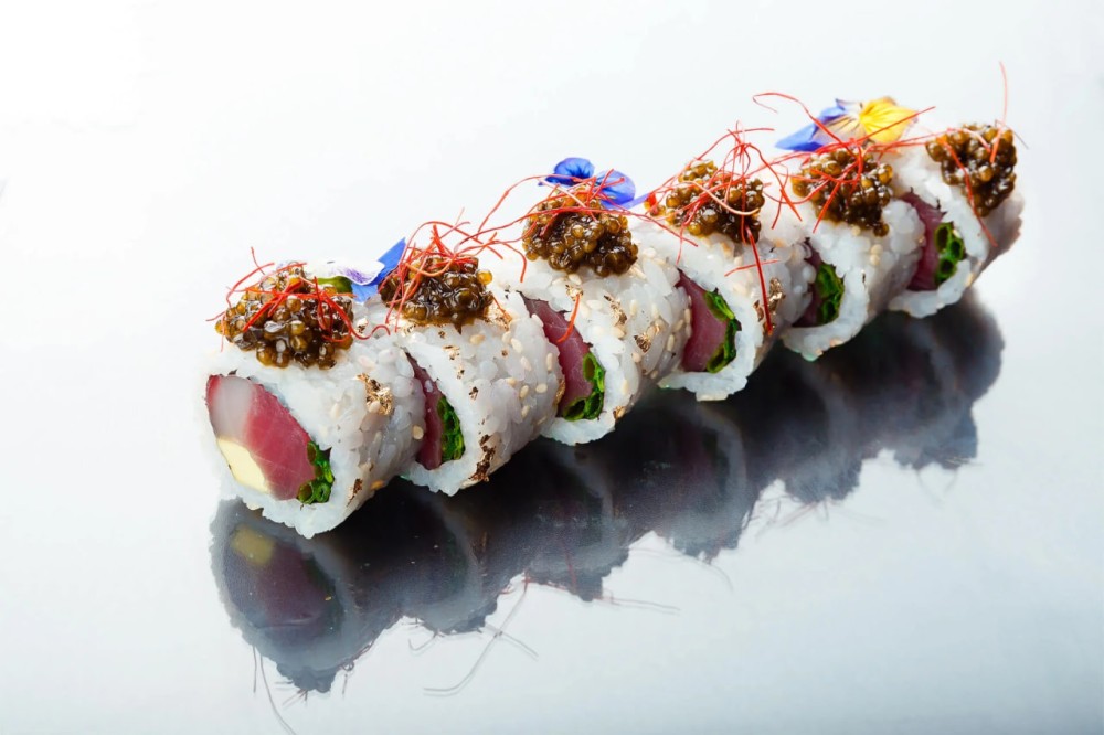 Тунец, окунь, авокадо, лук зеленый, черная икра, рис шинаки, нори