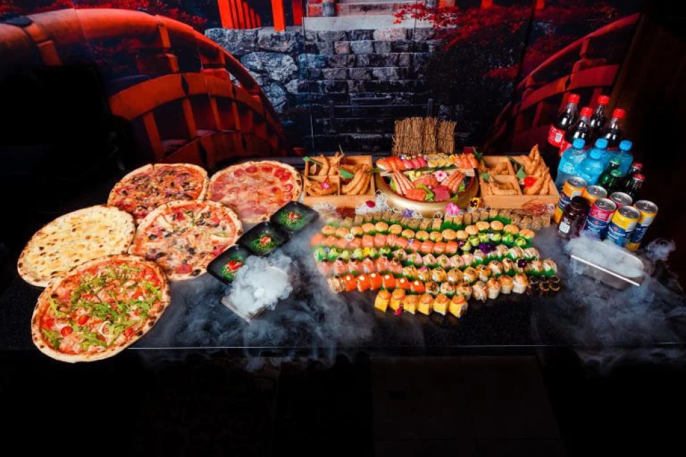 Предзаказ за 1 день! ролл «Маки» 118 шт, ролл «Темпура из креветок» 25 шт, Сашими (креветка, лосось, тунец) 200 гр, Суши (лосось, тунец,томаго) 12 шт, Пицца 5 шт, салат «Чука» 3 шт, Кола 1л.4 шт, 0.25л 4 шт, Морс 0.3л 2 шт, «SanPellegrino» 6 шт, «Bonaqua» 0.5л